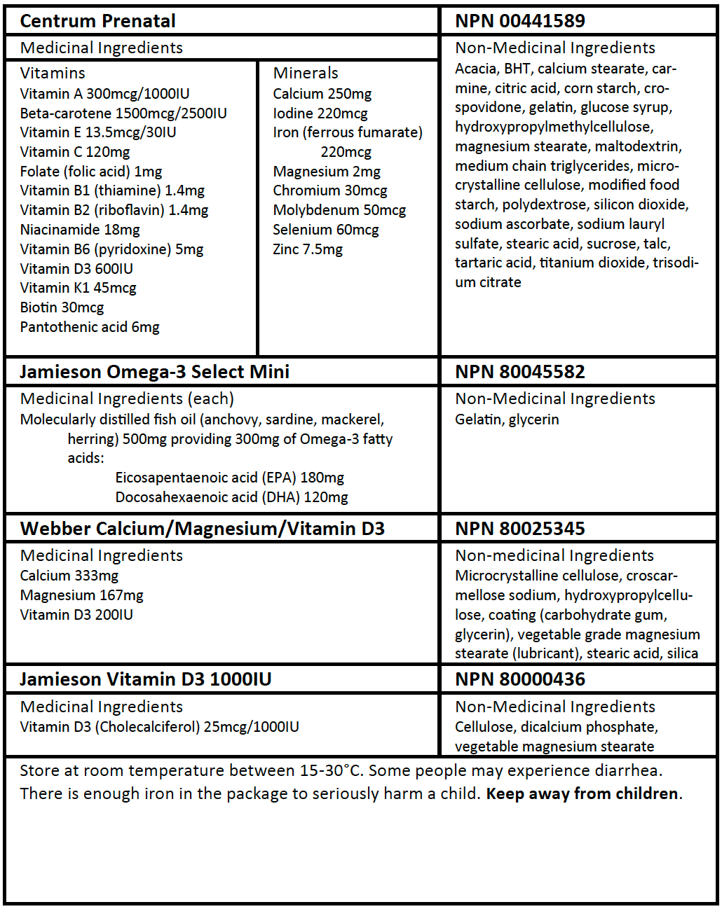 Non-medicinal Ingredients: [Centrum Prenatal: Acacia, BHT, calcium stearate, car-mine, citric acid, corn starch, cro-spovidone, gelatin, glucose syrup, hydroxypropylmethylcellulose, magnesium stearate, maltodextrin, medium chain triglycerides, micro-crystalline cellulose, modified food starch, polydextrose, silicon dioxide, sodium ascorbate, sodium lauryl sulfate, stearic acid, sucrose, talc, tartaric acid, titanium dioxide, trisodium citrate], [Omega 3: Gelatin, glycerin], [Calcium/Magnesium/Vitamin D3: Microcrystalline cellulose, croscar-mellose sodium, hydroxypropylcellu-lose, coating (carbohydrate gum, glycerin), vegetable grade magnesium stearate (lubricant), stearic acid, silica], [Vitamin D3 1000IU: Cellulose, dicalcium phosphate, vegetable magnesium stearate].