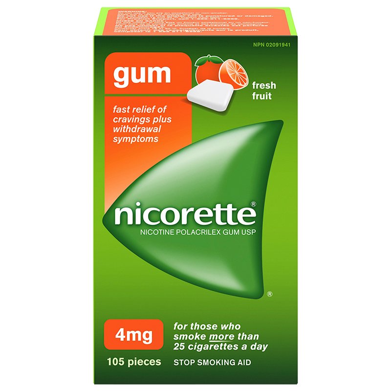 Nicorette Gum works fast to relieve your cravings plus withdrawal symptoms to help you quit smoking. Containing 2 or 4 milligrams of nicotine per piece, this gum helps fight the craving to smoke and helps reduce unpleasant withdrawal symptoms. Using Nicorette Gum correctly can double your chances of quitting versus willpower alone. Chew a piece of this Nicorette gum whenever you feel the urge to smoke, up to 20 times a day. This nicotine-based gum is indicated for adults smoking 25 cigarettes or less a day, who want to quit smoking immediately or quit gradually by reducing the amount of cigarettes they smoke each day.