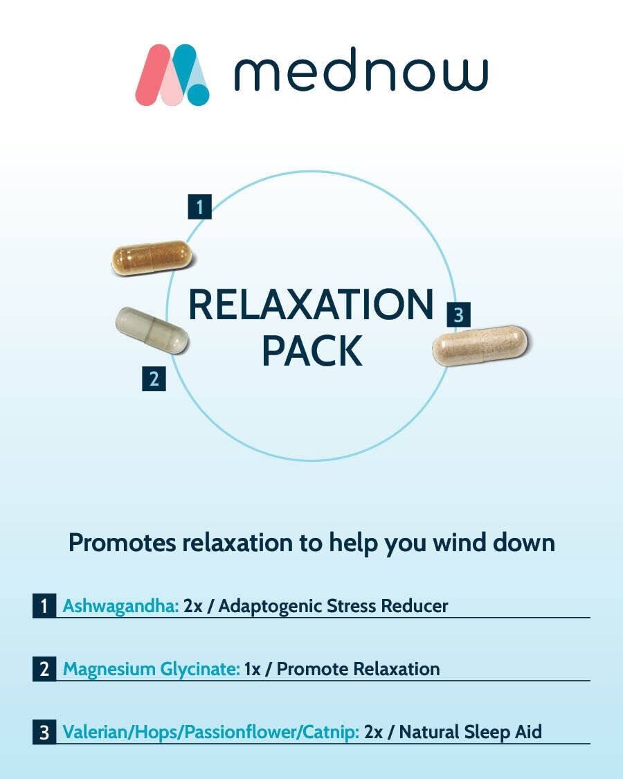 Medicinal Ingredients: [Stress Relief Ashwagandha: Ashwagandha extract 300mg (equivalent to 1200mg of dry ashwagandha roots)], [Magnesium Glycinate: Magnesium glycinate blend (magnesium glycinate chelate, glycine, magnesium oxide) 200mg], [Relax & Sleep Valerian Complex: Valerian (4:1) extract 50mg (equivalent to 200mg of raw herb), Hops (4:1) extract 25mg (equivalent to 100mg of raw herb), Passionflower (4:1) extract 25mg (equivalent to 100mg of raw herb), Catnip 20mg].