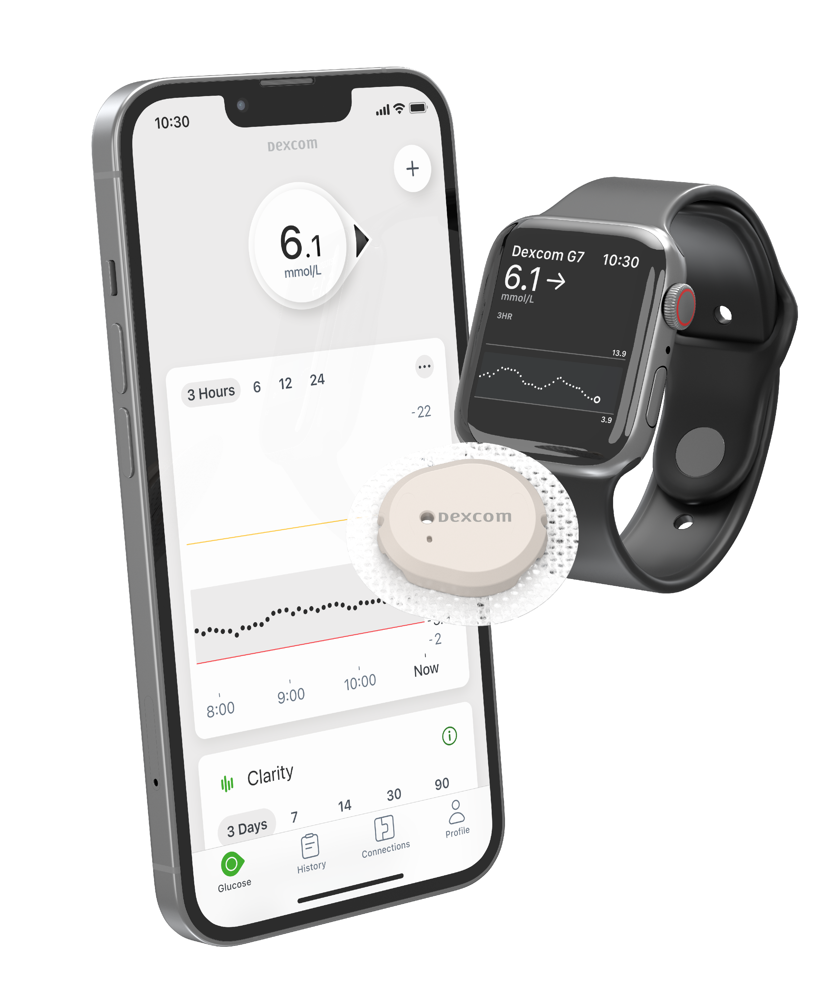 ¶ Compatible smartphone is required to pair a new Dexcom G7 sensor with a compatible Apple Watch. To use Share/Follow, the smartphone must be within 10 meters (33 feet) of the Dexcom G7.
